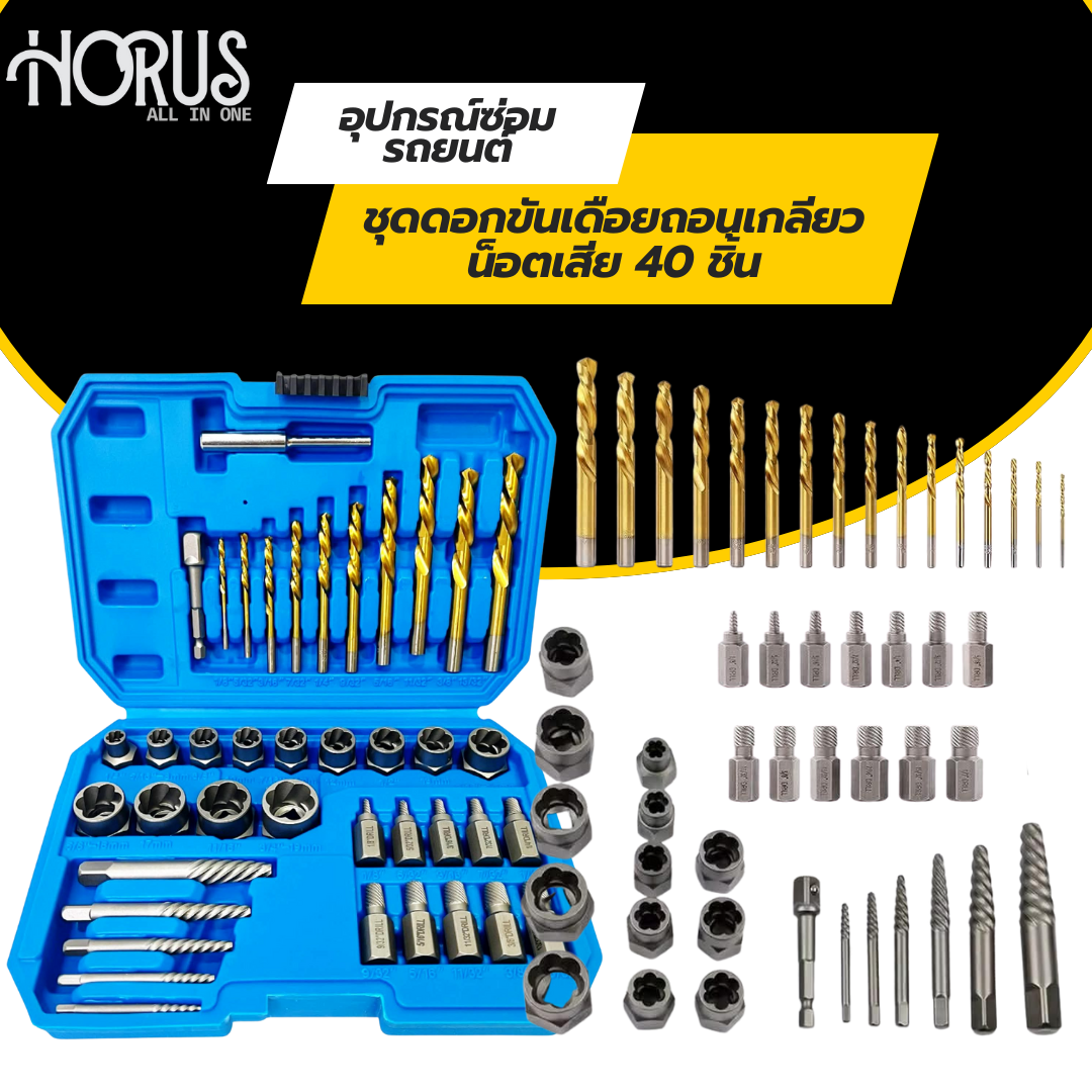HORUS ชุดถอดน็อตเสีย สกรูรูด 40 ชิ้น ลูกบล็อกและดอกถอน ครบ ถอดน็อตหัวหักที่เสียหาย ขนาด 3-8 นิ้ว พร้อมอแดปเตอร์ต่อสว่าน