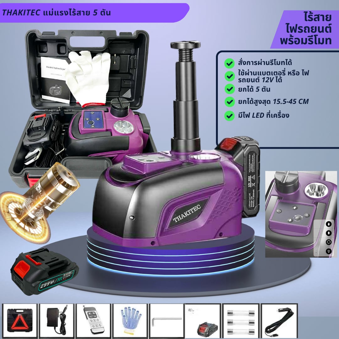 THAKITEC  แม่แรงไฮดรอลิกไร้สาย 5T ทำงานร่วมกับแบตเตอรี่ หรือ เต้าเสียบไฟรถยนต์ 12V สามารถยกรถได้ภายในเวลาไม่ถึง 1 นาที