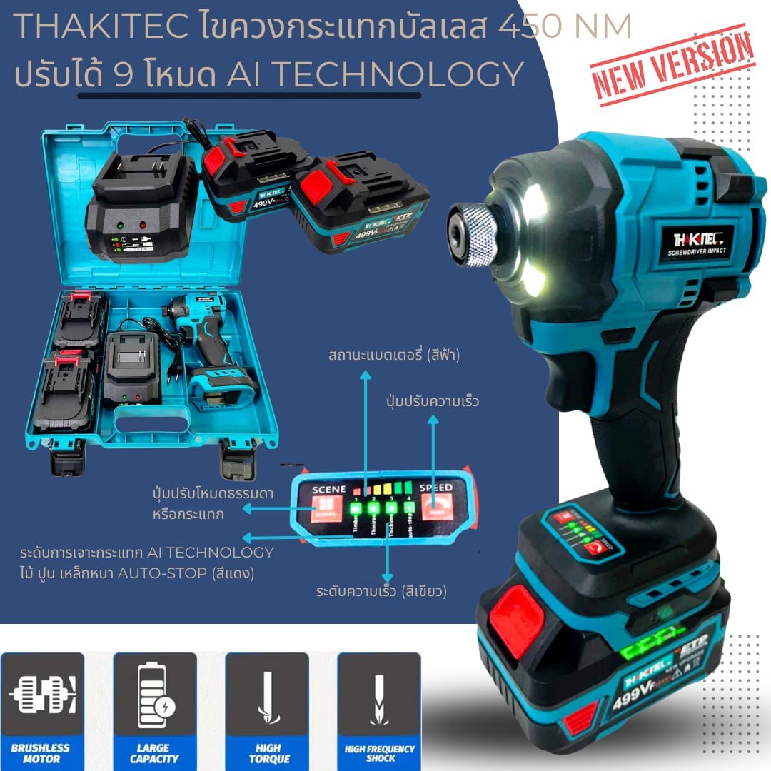 ใหม่ THAKITEC ไขควงกระแทกไร้สาย AI TECHNOLOGY มอเตอร์บัสเลส แบต ALL NEW 499Vf ปรับโหมดได้ 9 โหมด รุ่นออกแบบพิเศษ