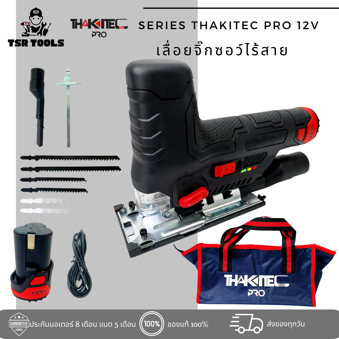 "THAKITEC มาพร้อมซีรีย์ใหม่ ซี่รีย์ THAKITEC PRO 12VMAX มาพร้อมแบตเตอรี่ลิเธียมไอออน 12VMAX ความจุเต็ม 2000 mAh และมาพร้อมกับการชาร์จแบบ TYPE-PORT หรือ TYPE-C หาง่ายและสะดวกกว่าที่เคย เครื่องมือช่างขนาดมินิที่มาพร้อมขุมพลังที่จัดเต็มเรื่องคุณภาพการทำงานได้อย่างมีประสิทธิภาพ ไม่ว่าจะเป็นสาย DIY หรือ ช่าง ก็ตอบโจทย์ได้อย่างแน่นอน และยังไม่พอ เรายังเพิ่มความรับประกันคุณภาพไปอีก ซีรีย์นี้มีประกันเต็ม 8 เดือน รับประกันกันไปยาวๆ ฟรีค่าซ่อม ค่าอะไหล่ กันเลย" - PURE COPPER MOTOR : มอเตอร์ทองแดงแท้ที่ทำให้สูญเสียพลังงานน้อยกว่า กินไฟน้อยลงในระยะยาว พร้อมทนความร้อน และเพิ่มแรงบิดให้ได้อย่างสม่ำเสมอ เหมาะกับงานหนัก - MINI FUNCTION BUT MORE POWER : เครื่องกระทัดรัดที่พกพาสะดวก ขนาดเล็กและมีกำลังมาก แต่เต็มไปด้วยประสิทธิภาพที่สูงสุด - THERMOPLASTIC ELASTOMER : วัสดุทำมาจากยางสังเคราะห์ที่มีรูปเหมือนพลาสติก และด้ามจับที่ทำให้นุ่มมือ กันลื่น และทนทาน ป้องกันการกระแทกได้ดี - LONGER USE TIME : แบตเตอรี่ลิเธียมไอออนให้กำลัง 12VMAX และความจุ 2000 mAh แท้ ที่ทำให้การใช้งานได้ยาวนานขึ้น - TYPE - PORT CHARGER : ที่ชาร์จมาในรูปแบบใหม่ ที่ตอบสนองความสะดวกสบายในยุคสมัยปัจจุบัน เป็นการชาร์จ TYPE-C - เลื่อยจิ๊กซอว์ไร้สาย รุ่น TKJS12 - ปรับความเร็วได้ เพื่อปรับให้เหมาะกับวัสดุที่ต้องการตัด - เปลี่ยนใบเลื่อยง่าย ด้วยระบบล็อกแบบ Lever-action สะดวกสบายและรวดเร็ว - มีระบบ Dust Blower ดูดฝุ่น - ปรับระดับการชักได้ ถึง 3 ระดับ - ปรับมุมตัดได้ 45 องศา และมีระบบการควบคุมแรงสั่น - มีไฟ LED ส่องขณะทำงาน - Rate Voltage : 12VMAX - Battery Capacity : 2.0 Ah - No-load Speed : 1500-2800 rpm - Chuck size : 18 MM - Adjust Speed : 1-6 SPEED - สวิตช์เปิด-ปิด - บอกสถานะแบตเตอรี่บนตัวเครื่อง - ประกอบไปด้วย 1 * THAKITEC เลื่อยจิ๊กซอว์ไร้สาย รุ่น TKJS12 1 * แบตเตอรี่ลิเธียมไอออน 12VMAX 1 * สายชาร์จ TYPE-C 1 * อุปกรณ์ใบเลื่อย 1 * กระเป๋าผ้า THAKITEC PRO เย็บหนา 2 ชั้น