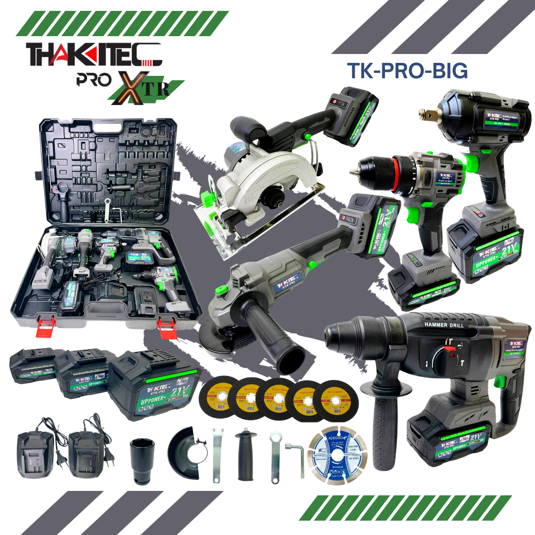 - THAKITEC PRO มาจัดเครื่องมือช่างไร้สาย ชุดใหญ่ไฟกระพริบ 5 ชิ้น ได้แก่ สว่านไร้สาย บล็อกไขควงไร้สาย สว่านโรตารี่สกัดไร้สาย เครื่องเจียร์ไร้สาย และเลื่อยวงเดือนไร้สาย ทั้งหมดเป็นมอเตอร์บัลเลส รุ่น TK-PRO-BIG