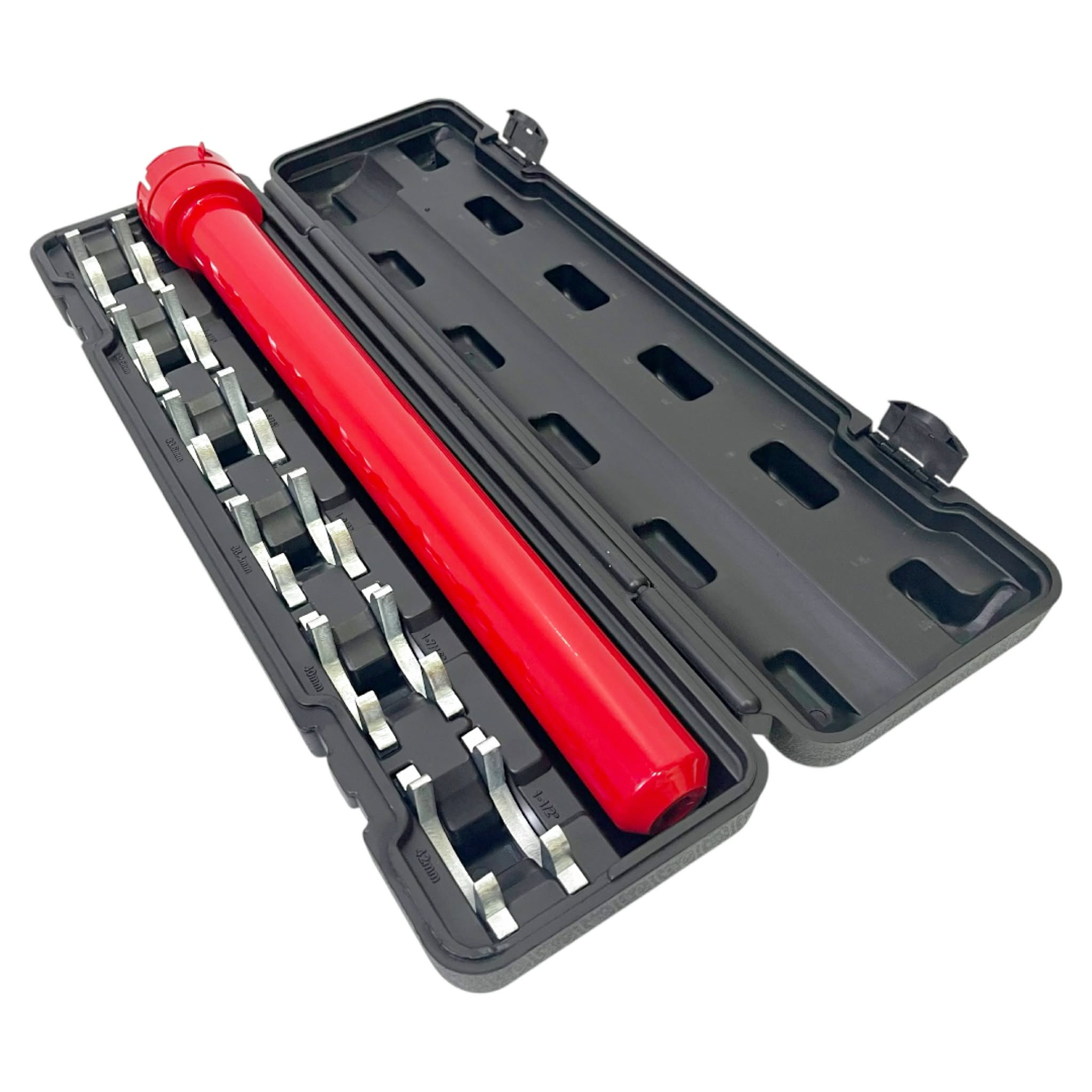 - ชุดเครื่องมือประกอบด้วย ข้อต่อแบบกรงเล็บ 12 ขนาด : 1-3/16", 1-1/4", 1-5/16", 1-3/8", 1-7/16", 1-1/2", 29 มม., 32.5 มม., 33.6 มม., 38.4 มม., 40 มม., 42 มม.